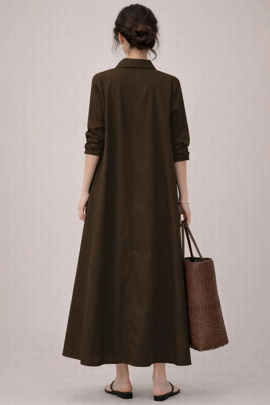 Coffee Cotton Maxi Shirt Dress