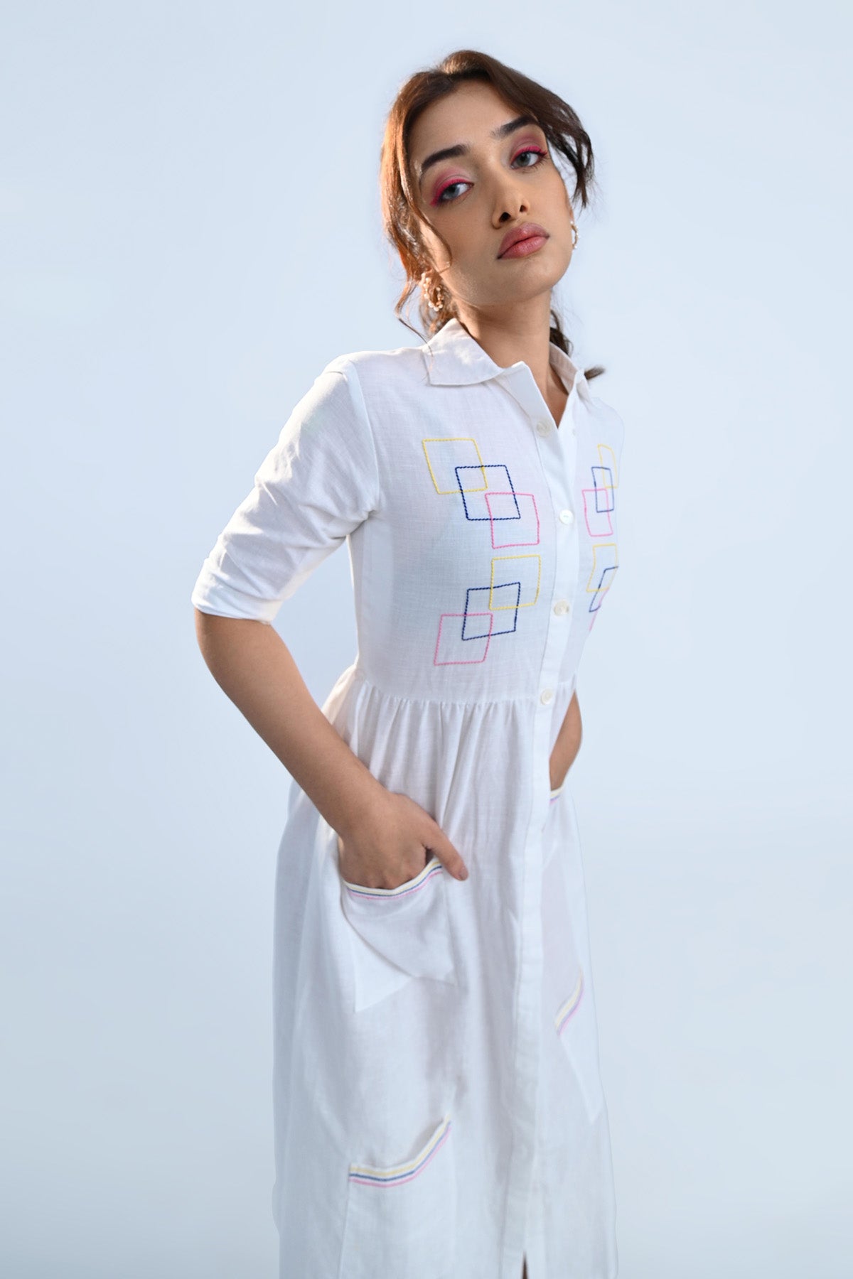 White 100% pure cotton linen multicolor thread cubes embroidered dress with pearl buttons, collared neck & 4 front pockets. Note: The length of the dress is 50 inches