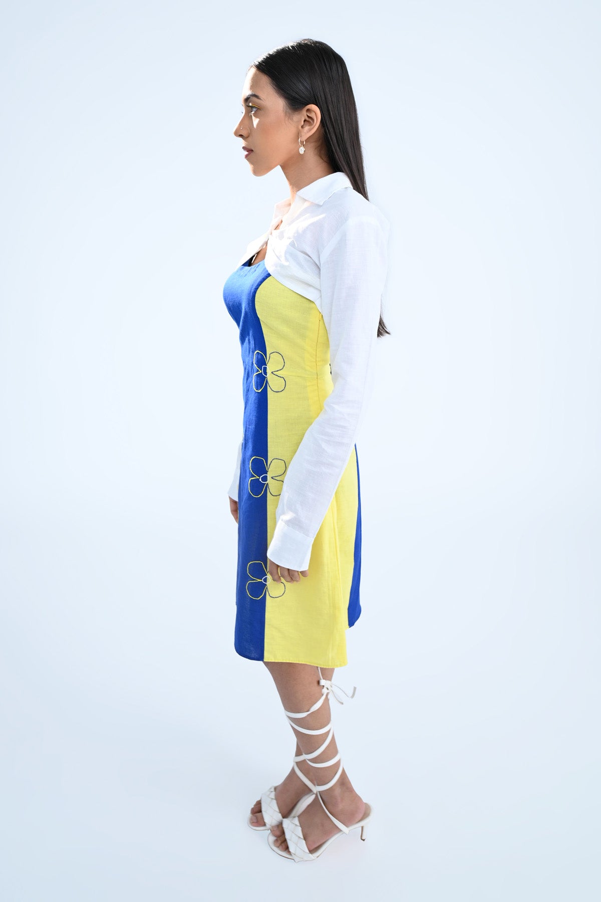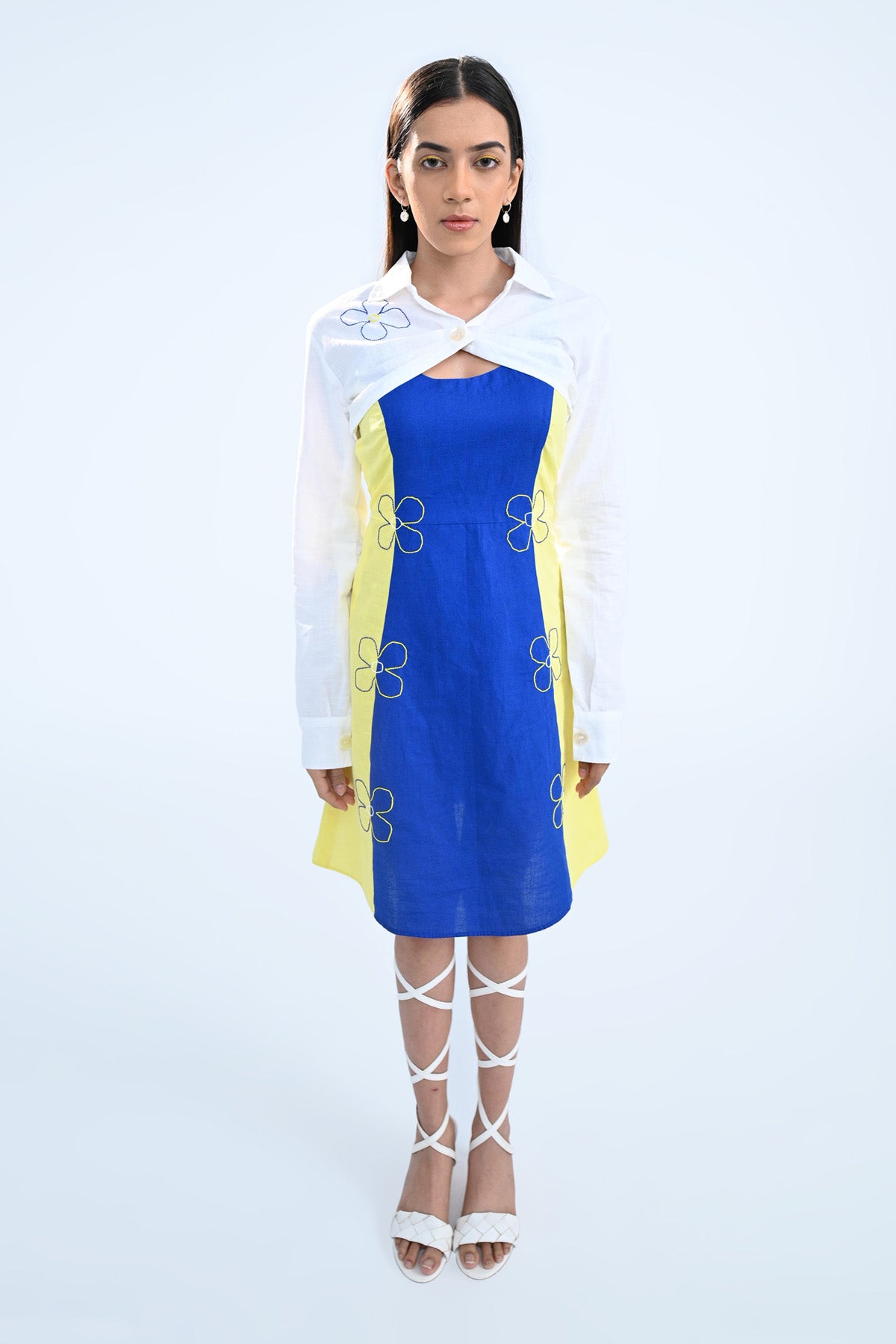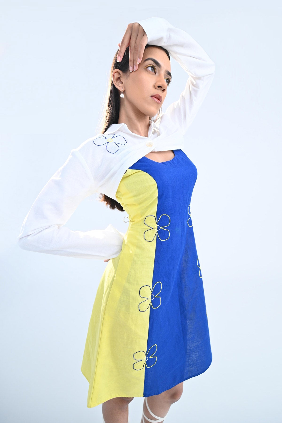 White 100% pure cotton linen crop jacket enhanced with floral thread embroidery and pearl button. Note: The front length of the crop jacket is 8 inches and back 10 inches