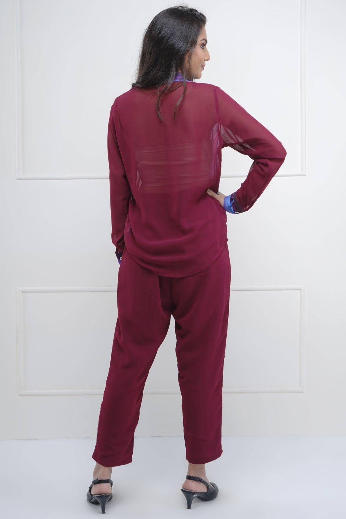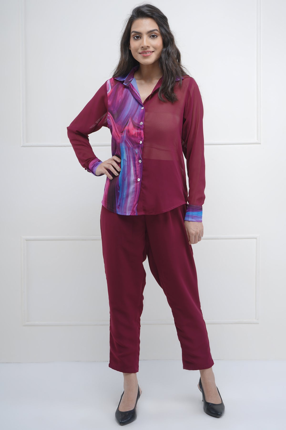 Maroon abstract printed georgette buttoned shirt with full sleeves and collar. Note: Print placement may vary according to size