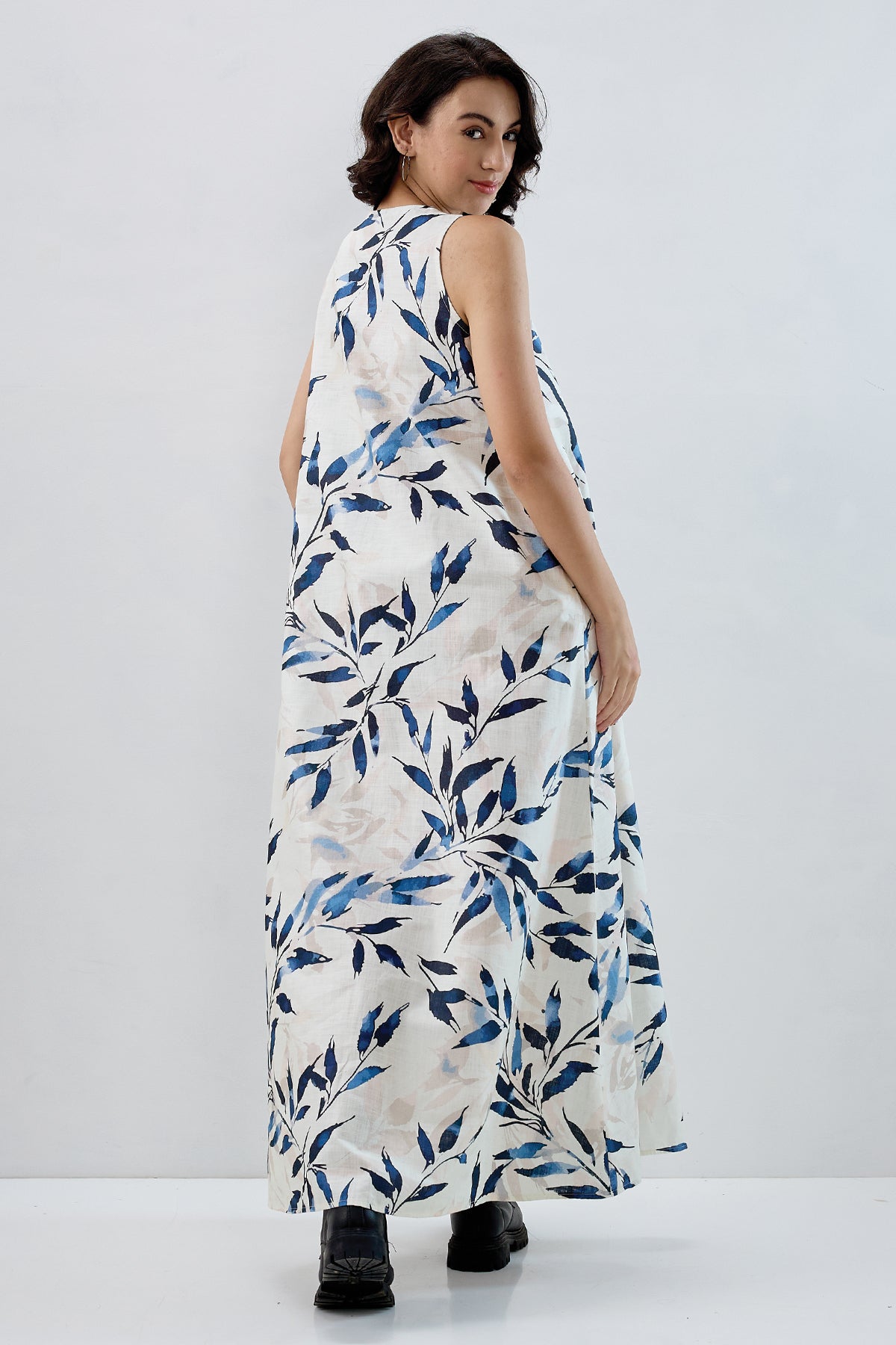 White 100% cotton maxi dress with blue leaf print, sleeveless, v-neck and side pockets. The length of the dress is 55 inches