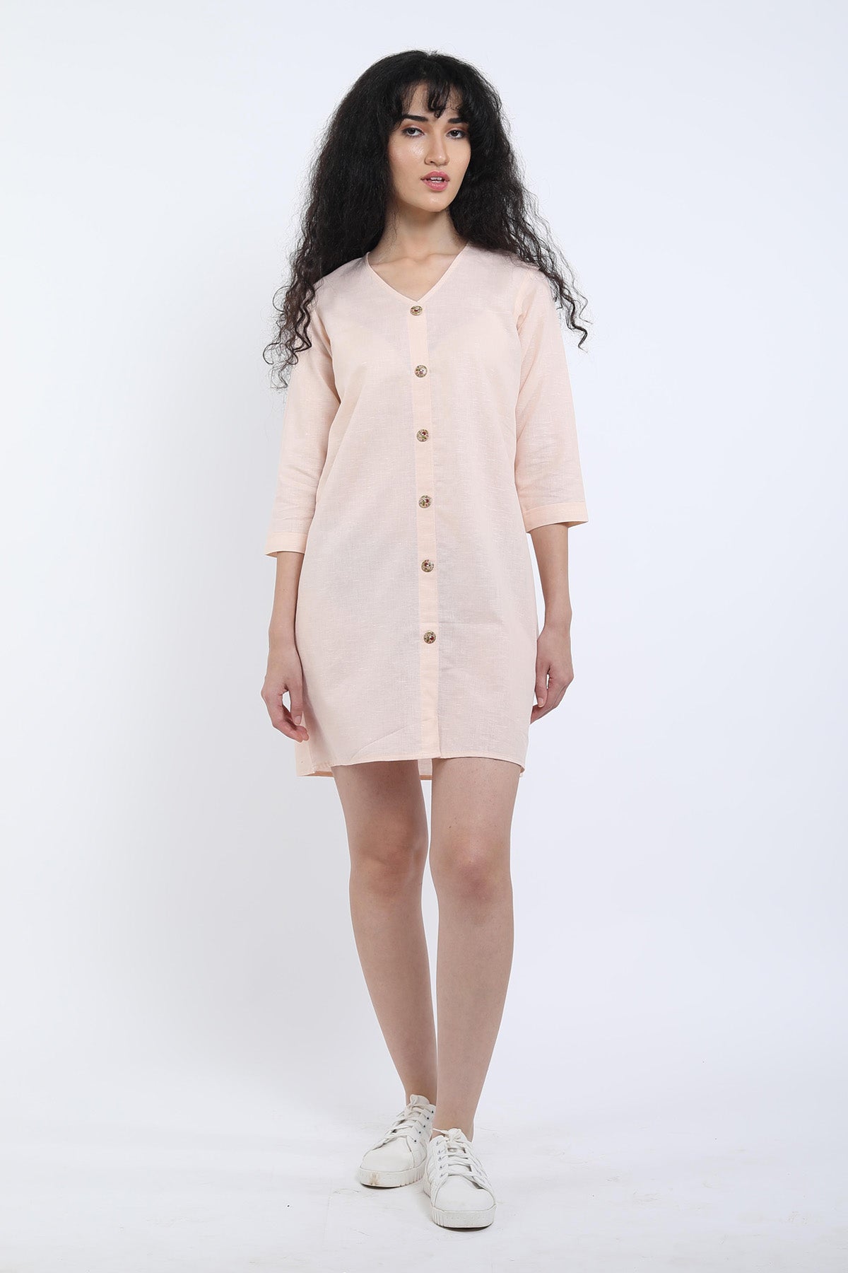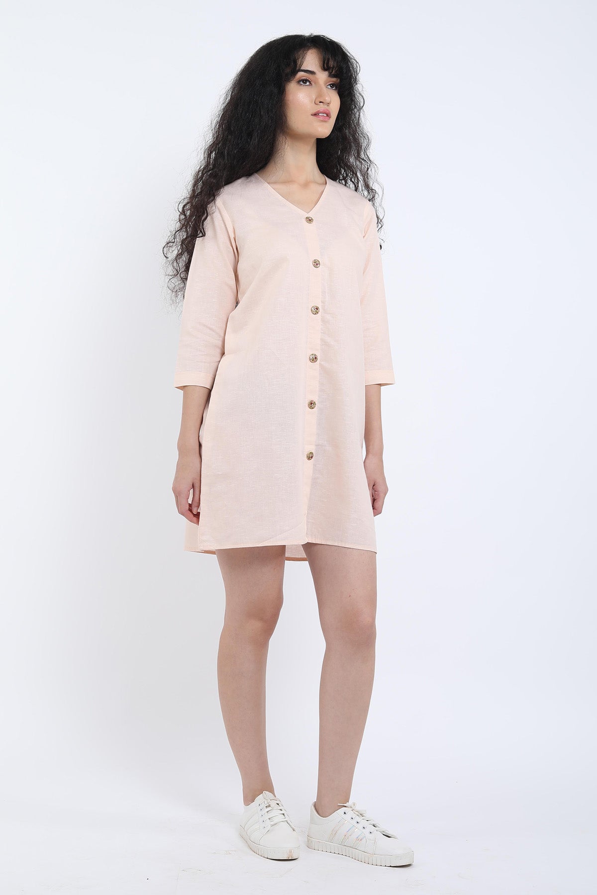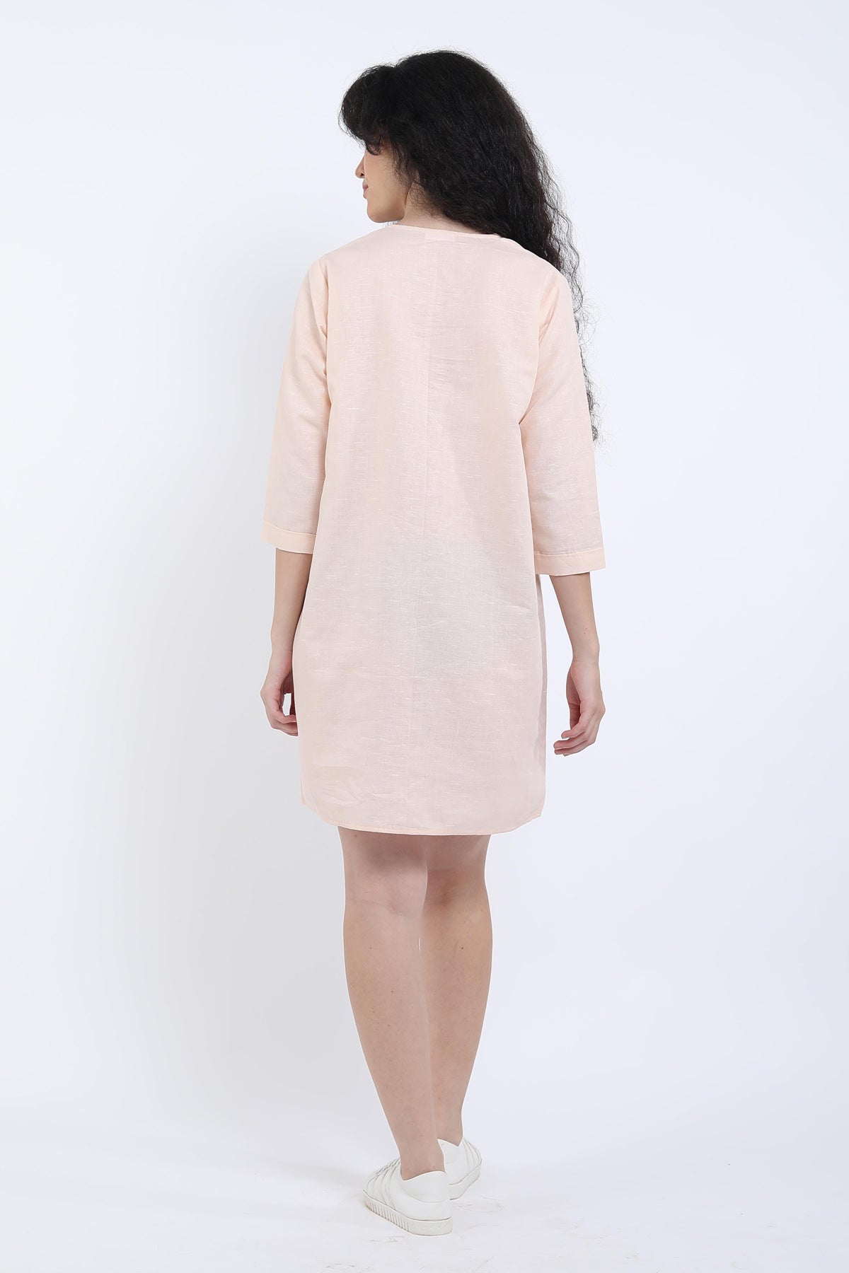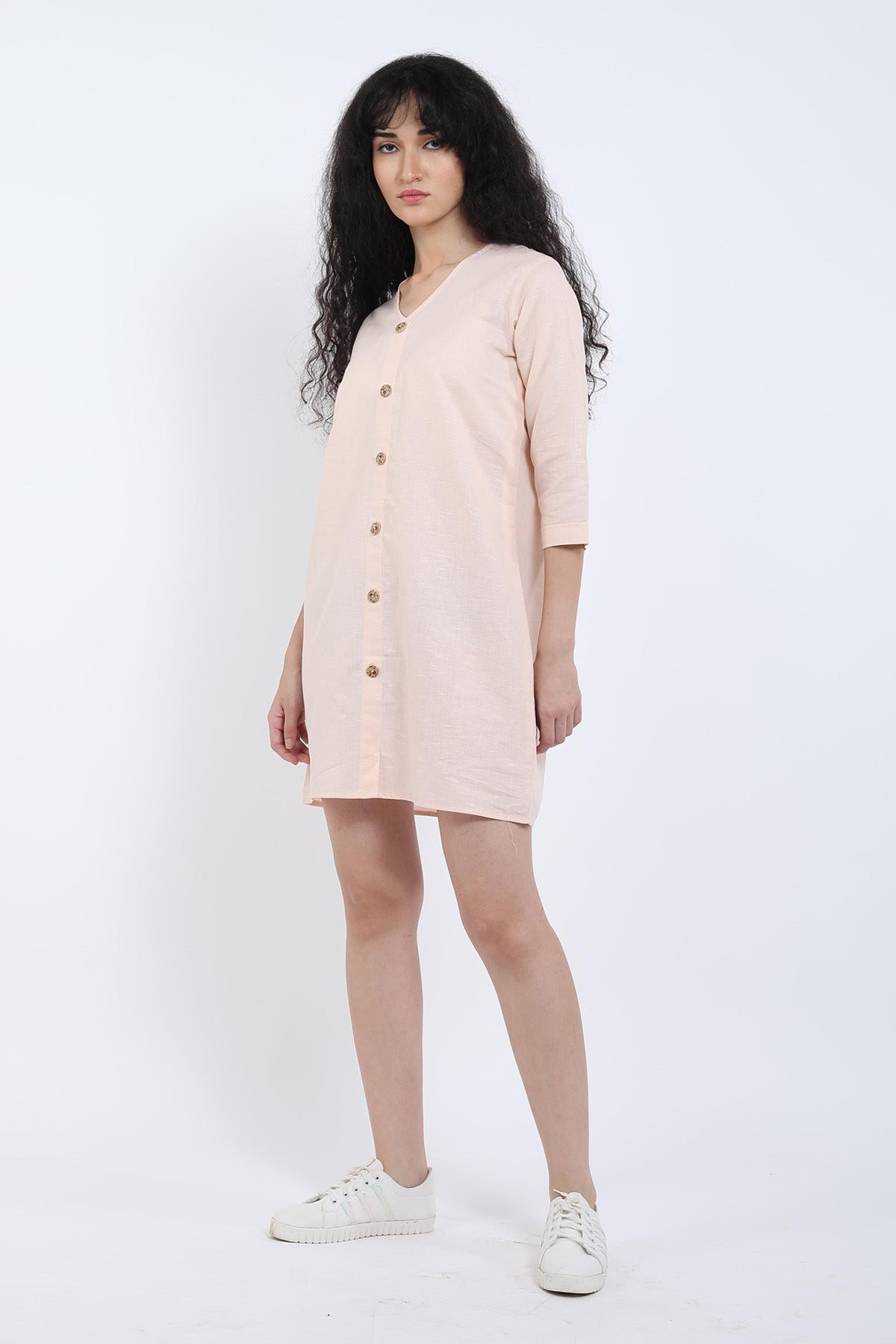 Peach cotton linen mini dress with show buttons and 35 inches length