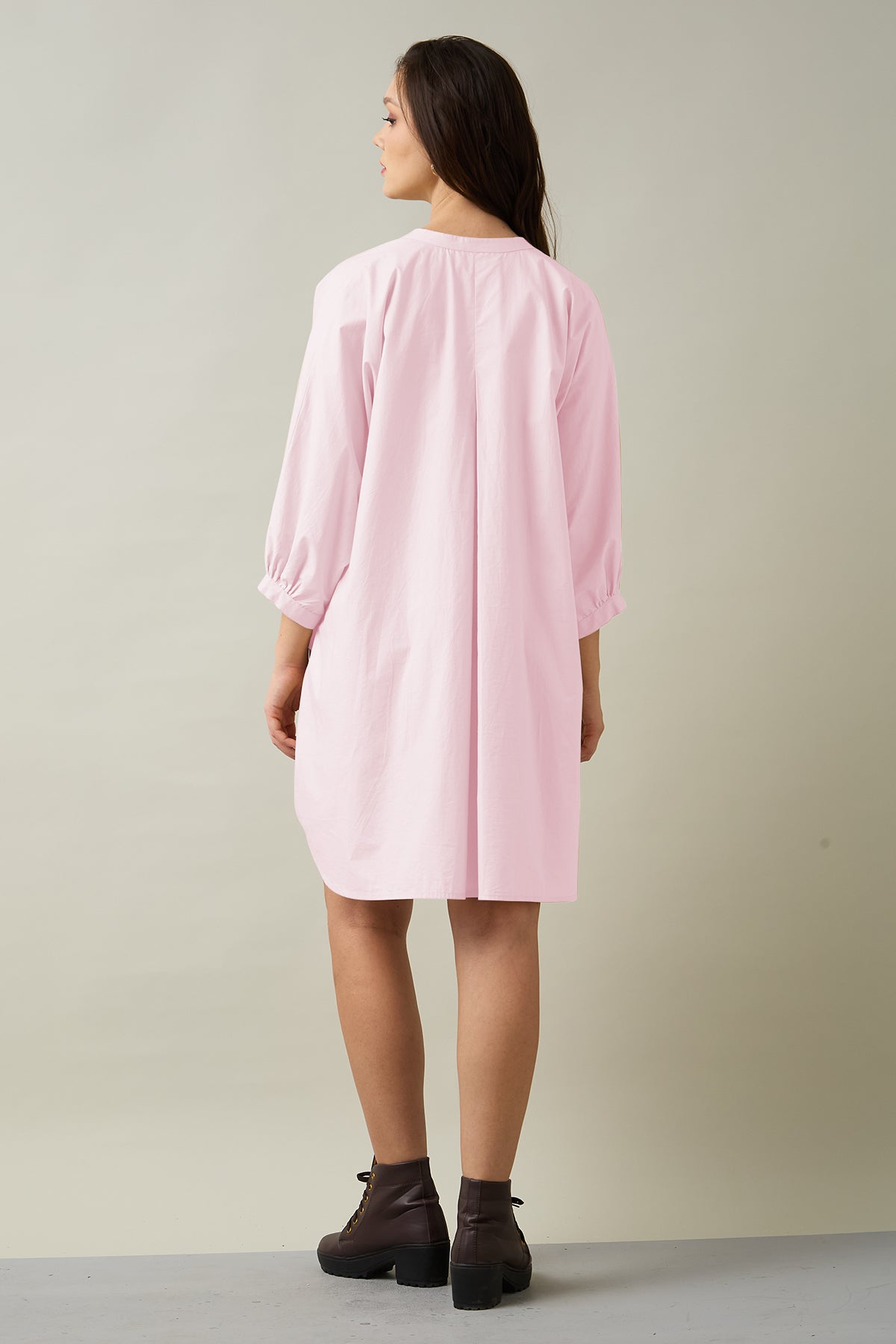 Pink 100% cotton poplin relaxed fit oversized shirt style dress with mandarin v-neck collar, side pockets, box pleat at back and buttons. The length of the dress is 37 inches