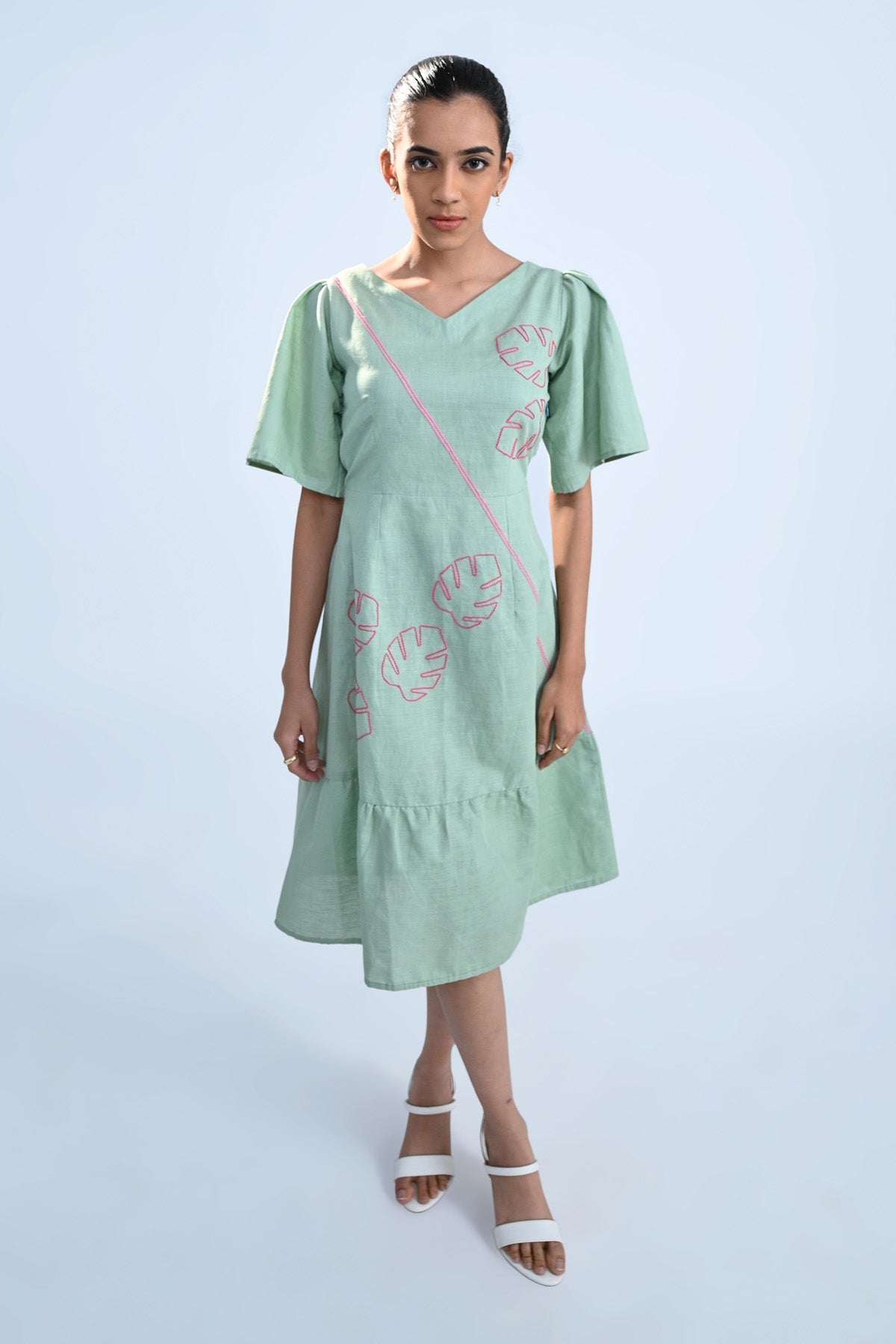 Sage green cotton dress enhanced with thread leaf embroidered and v-neckline. Note: The length of the dress is 37 inches